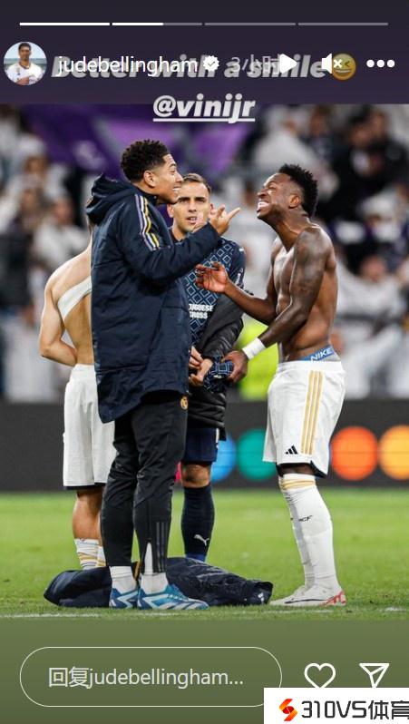 贝林厄姆晒赛后与维尼修斯合照:坚持愁容更好