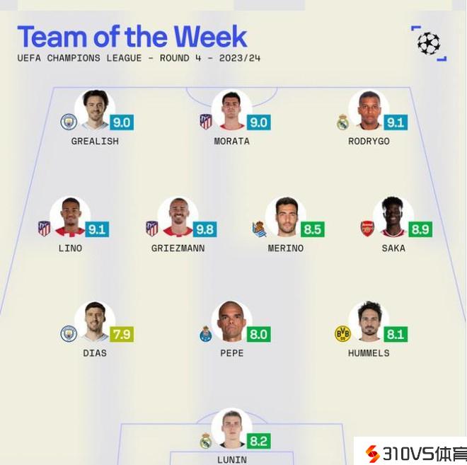 Sofascore评本轮欧冠最佳阵容:马竞双星领衔,老将佩佩在列