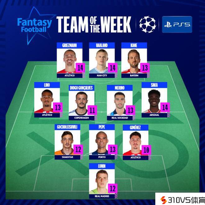 欧冠官方本轮最佳阵:凯恩哈兰德格子锋线三叉戟,佩佩在列