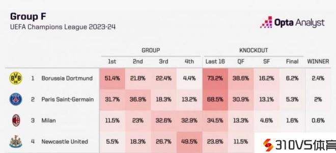 OPTA预测死亡之组出线情势:多特73%概率出线最高,米兰仅34.5%