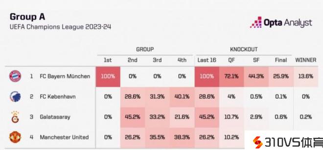 OPTA预测曼联欧冠小组出线概率仅为26.2%,列小组倒数第一
