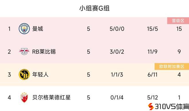 欧冠G组积分榜:曼城让二追三锁定头名 莱比锡9分第二