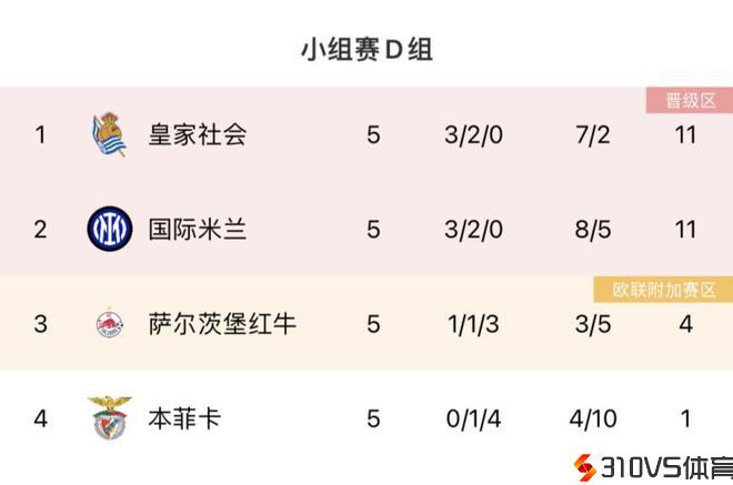 欧冠D组积分榜:皇社国米均战平同积11分末轮一战定头名