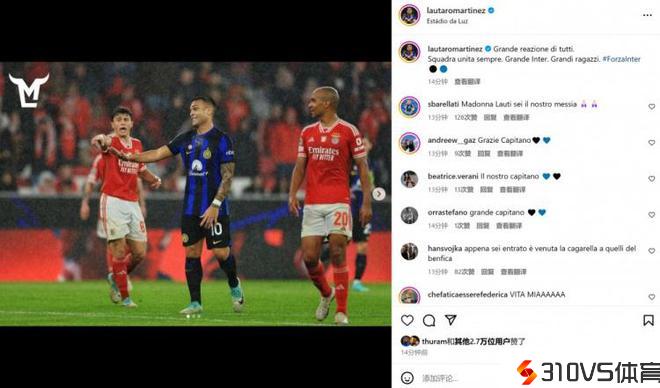 半场连追三球,劳塔罗社媒:球队拿出了很好的回应,一直勾搭一心