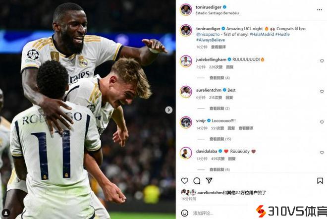 吕迪格社媒祝贺帕斯取得处子球:这是你未来很多进球中的第一个