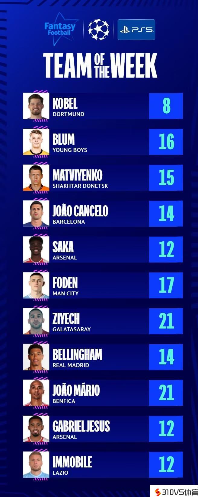 欧冠官方本轮最佳阵:贝林厄姆、福登在列,阿森纳两将中选