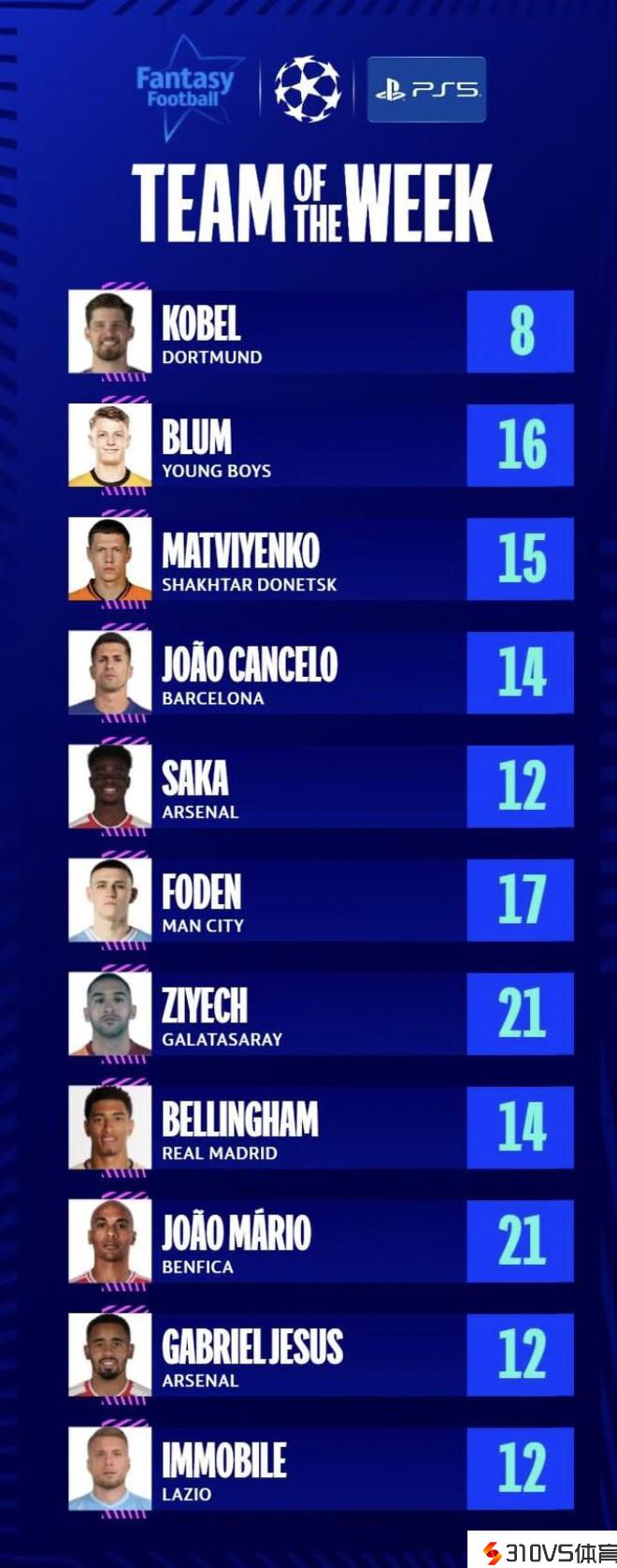 欧冠本周最佳阵容:齐耶赫领衔,贝林厄姆、坎塞洛中选