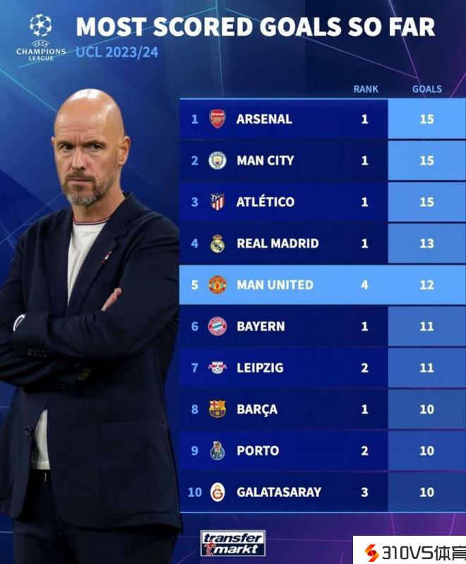 本赛季欧冠进球榜:曼城&阿森纳&马竞15球并列榜首,曼联第五