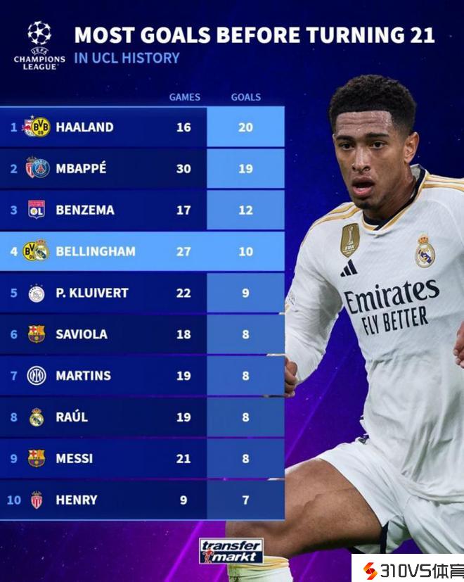 欧冠历史U21球员进球排名:哈兰德居首,姆巴佩第二梅西上榜