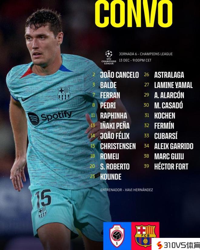 巴萨本轮欧冠大名单:特狮列席&莱万、德容轮休,多名小将中选
