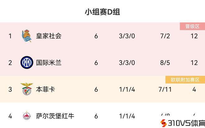 欧冠D组收官:皇社、国米均3胜3平,皇社净胜球占优居第一