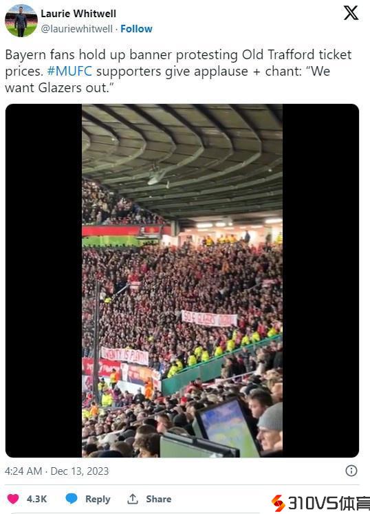 拜仁球迷拉横幅抗议格雷泽票价定太高,曼联球迷鼓掌:格雷泽滚蛋