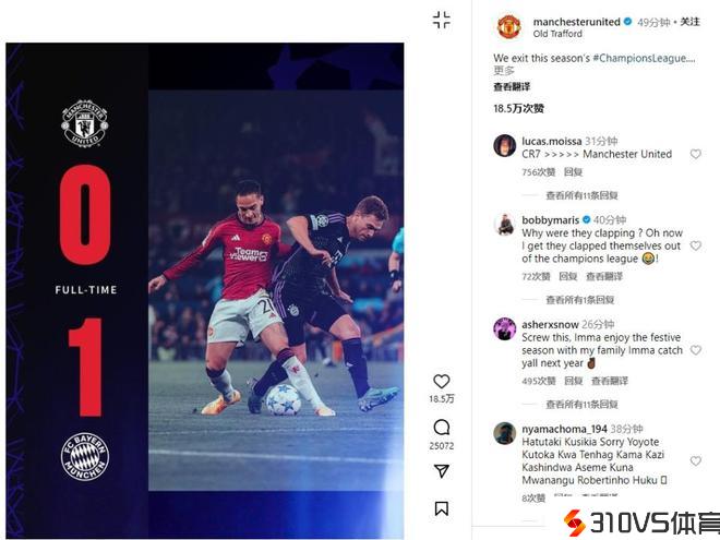 而在欧冠出局后,不满球队蹩脚战绩的曼联球迷,也再次攻陷了球队的官方社交账号,他们纷繁在官推发布的战报下面,留言宣泄自己内心的不满:“别说欧冠了,这支曼联不配参与任何级别的欧战!”;“就算再给90分钟,曼联也进不了拜仁1个球!”:“谁能想到,哥本哈根和加拉塔萨雷这样的球队,排名都比曼联还高!”
