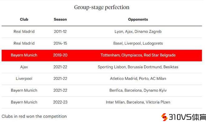 欧冠小组赛全胜统计:4队7次皇仁占5席,仅19-20赛季拜仁最终夺冠