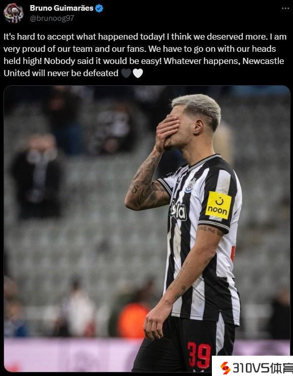 吉马良斯发文鼓舞球队:为纽卡和球迷感到自豪,我们不会被打败
