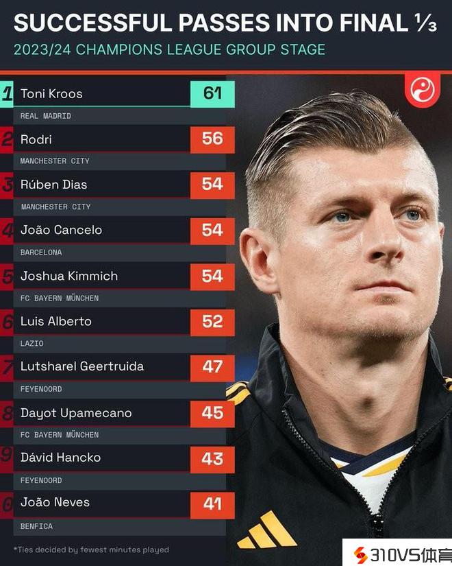 欧冠小组赛阶段进攻三区传球成功次数排名:克罗斯61次排第一