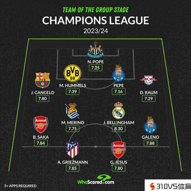 WhoScored欧冠小组赛最佳阵:贝林、坎塞洛中选,格子、萨卡在列