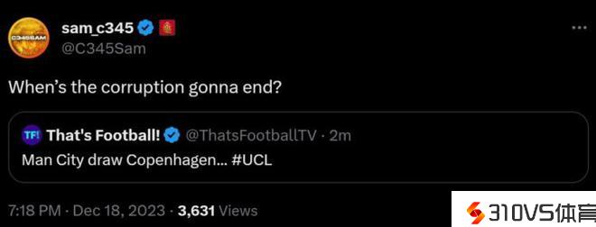 博主质疑曼城抽中“上上签”哥本哈根:啥时分能中止糜烂?