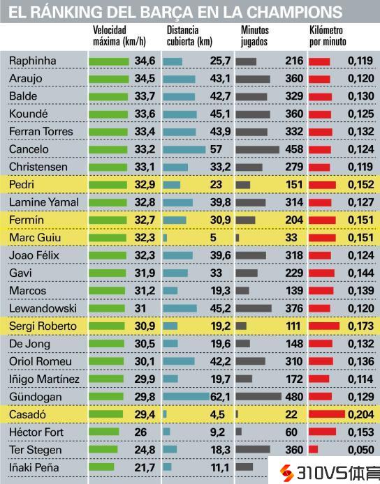 巴萨球员欧冠速度榜:拉菲尼亚34.6km/h第一,阿劳霍第二