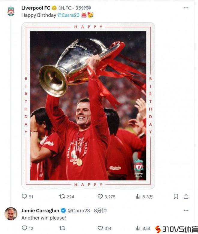 利物浦祝卡拉格46岁生日快乐,卡拉格留言:再赢一次欧冠吧!