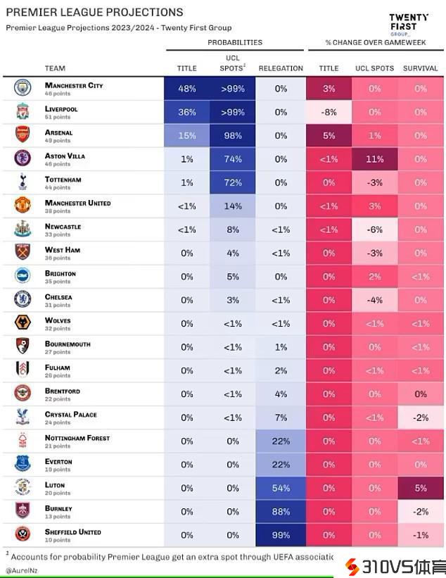 该公司剖析道,瓜迪奥拉的球队有48%的时机赢得联赛冠军,目前曼城在英超积分榜上落后利物浦5分。虽然击败了利物浦,但阿森纳赢得联赛冠军的时机仅为15%,而利物浦则有36%的时机。