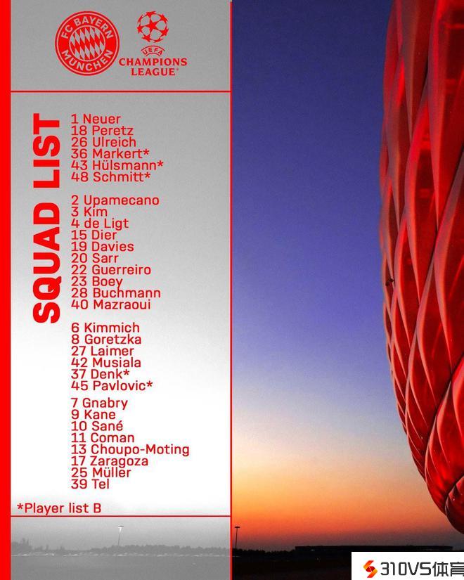 拜仁欧冠淘汰赛大名单:凯恩领衔,戴尔、博埃、萨拉戈萨在列
