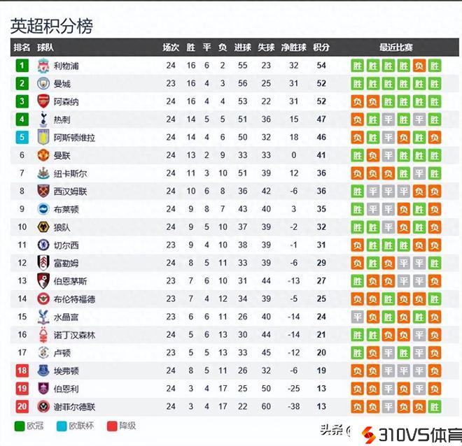 英超最新积分榜:利物浦、曼城、阿森纳齐头并进,曼联快第五了