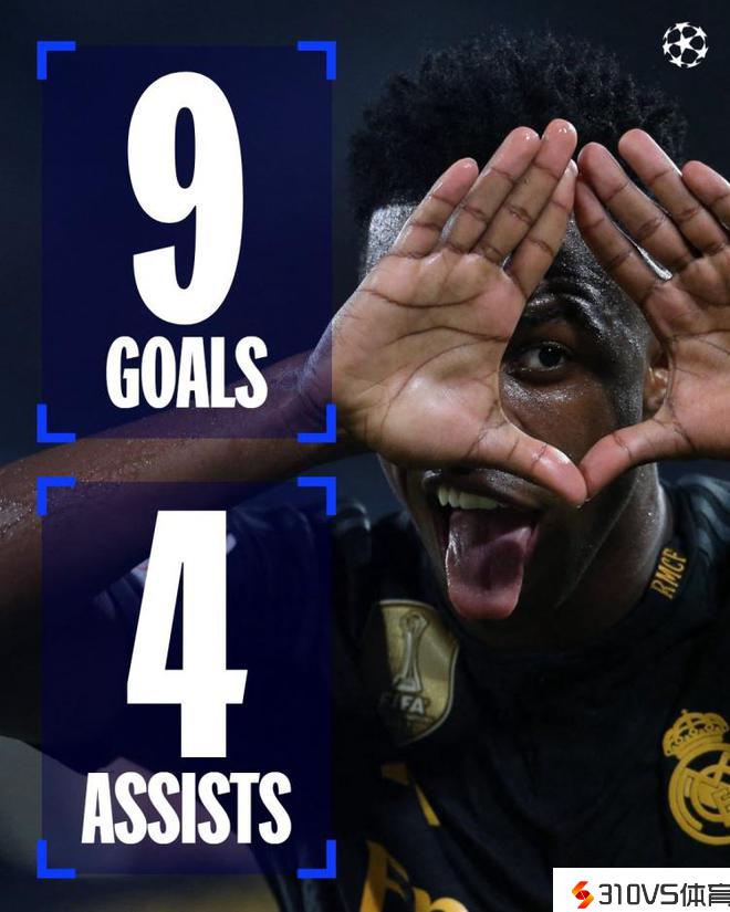 欧冠官方晒维尼修斯数据:近10场竞赛9球4助,参与13粒进球