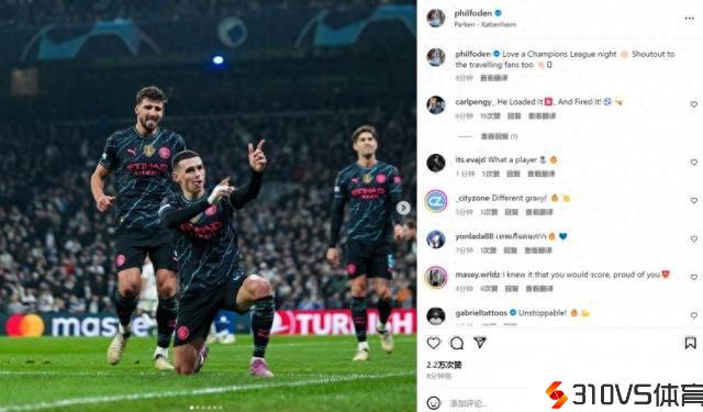 里程碑之战传射建功,福登社媒晒庆贺照:爱上这个欧冠之夜!