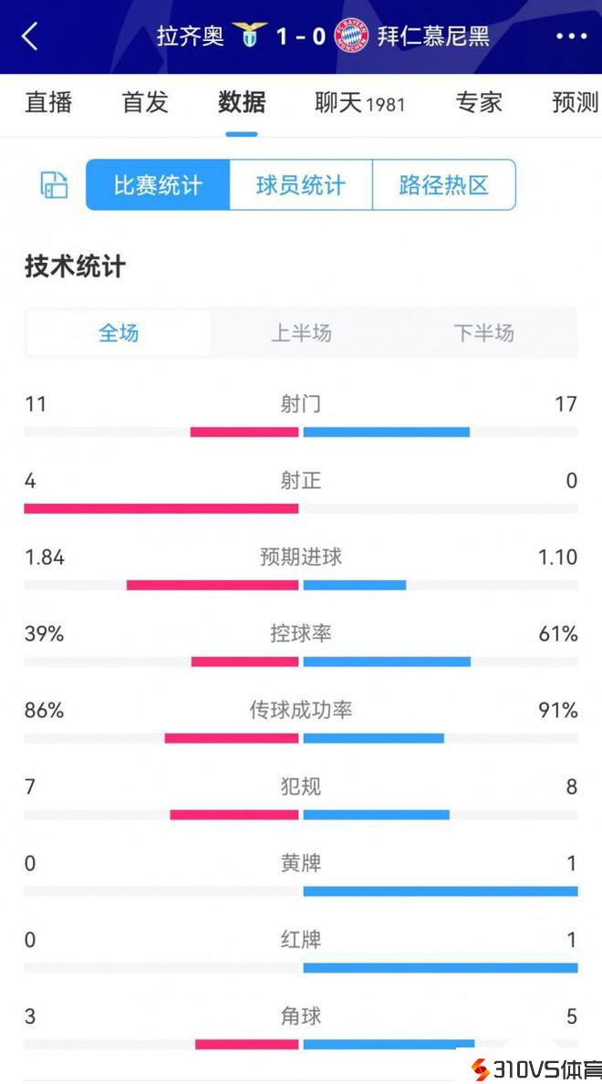 拜仁0-1拉齐奥全场数据:拜仁17射0正,蓝鹰11射4正
