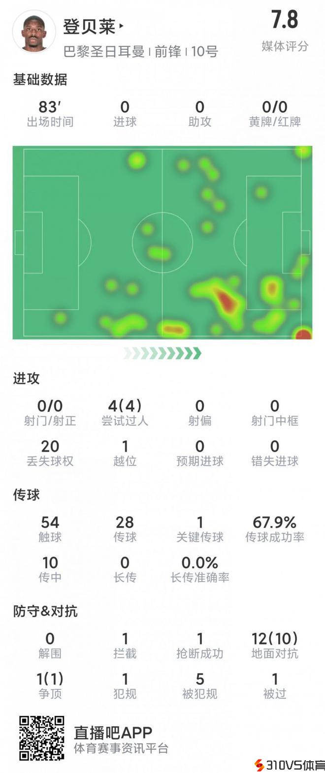 登贝莱本场数据:4次过人均成功,1次关键传球,13次对立11次成功