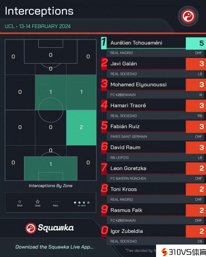 本轮欧冠阻拦榜:琼阿梅尼5次第一,格雷茨卡、克罗斯等并列第三
