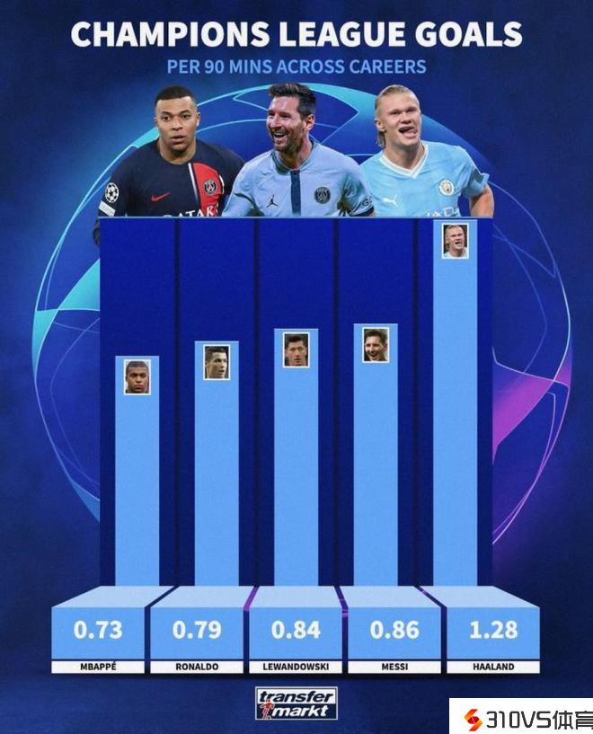欧冠每90分钟进球数:哈兰德1.28球,梅西0.86球,C罗0.79球