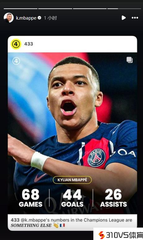 姆总ins分享自己欧冠数据:68场44球26助攻