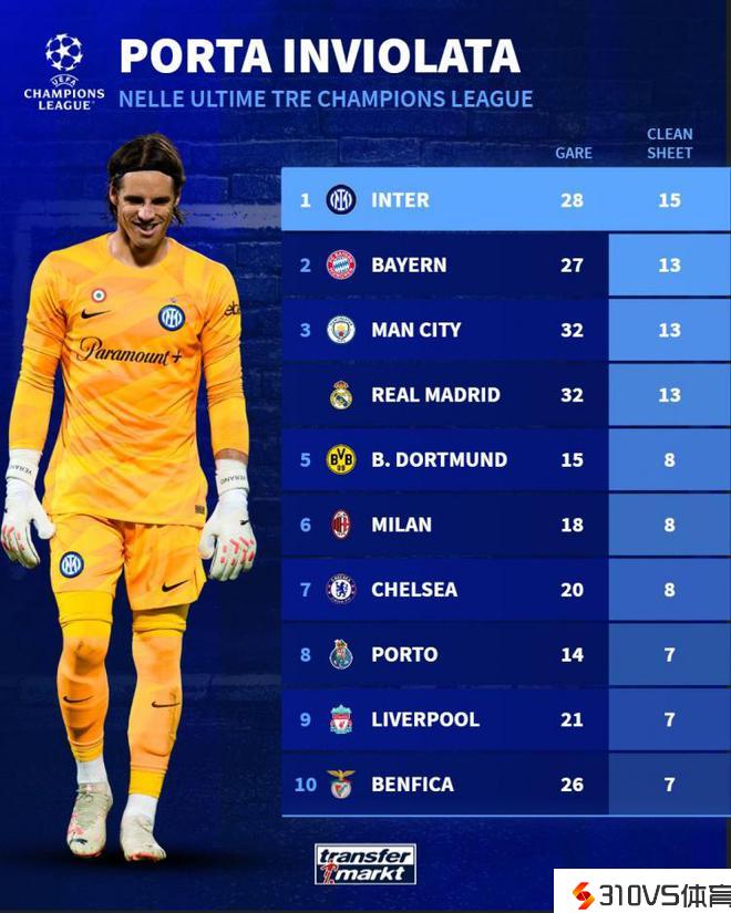 近3个赛季欧冠零封场次榜:国米15场居首,拜仁曼城皇马次席