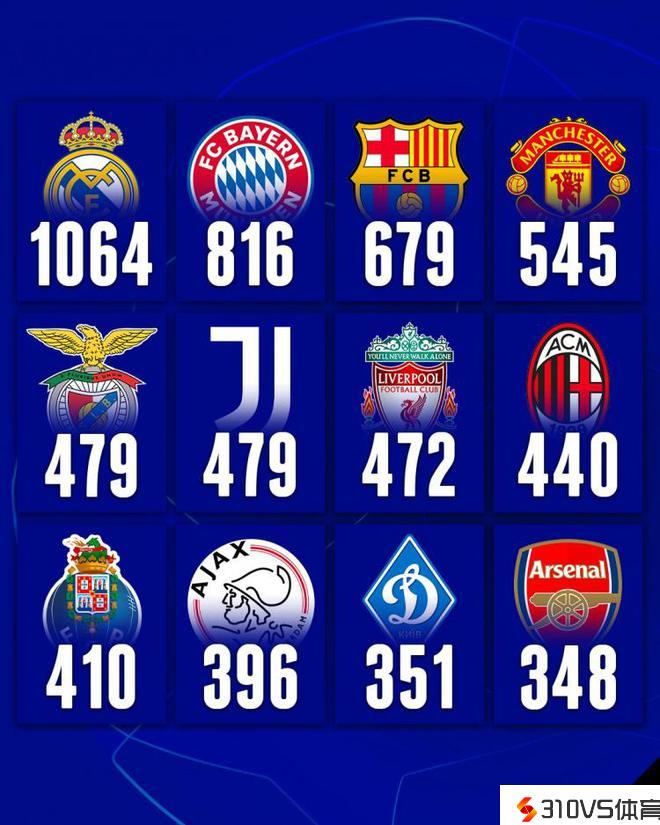 欧冠俱乐部进球排名:皇马1064球居首,拜仁、巴萨、曼联前四