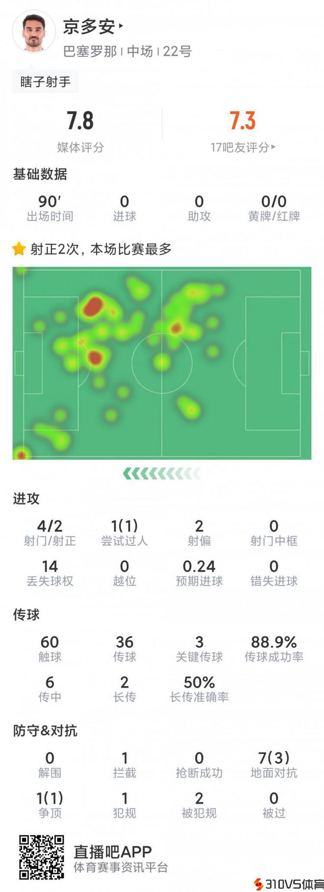 京多安本场数据:3次关键传球,4射2正,4次成功对立,评分7.8分