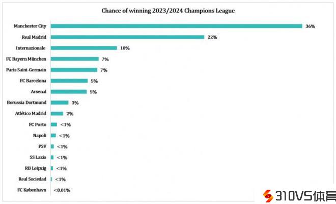 欧冠夺冠概率:曼城36%居首,皇马22%第二,7队低于1%