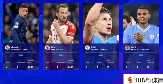 欧冠本周最佳球员候选:姆巴佩、凯恩、奥尔班、阿坎吉