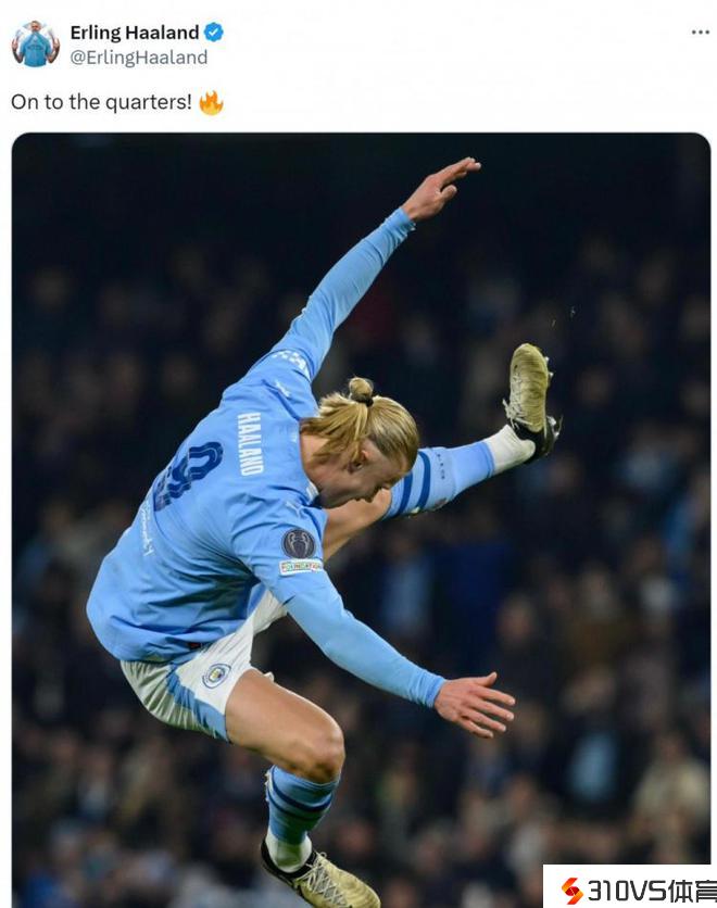 哈兰德社媒晒腾空照片庆贺成功:晋级1/4决赛!