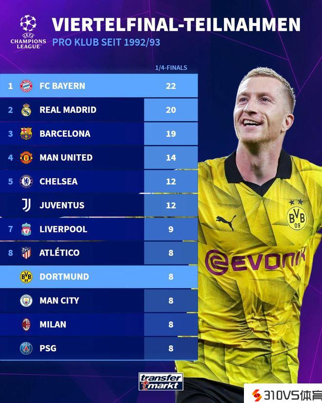 进入欧冠1/4决赛次数:曼城、米兰、巴黎、多特、马竞8次并列第8