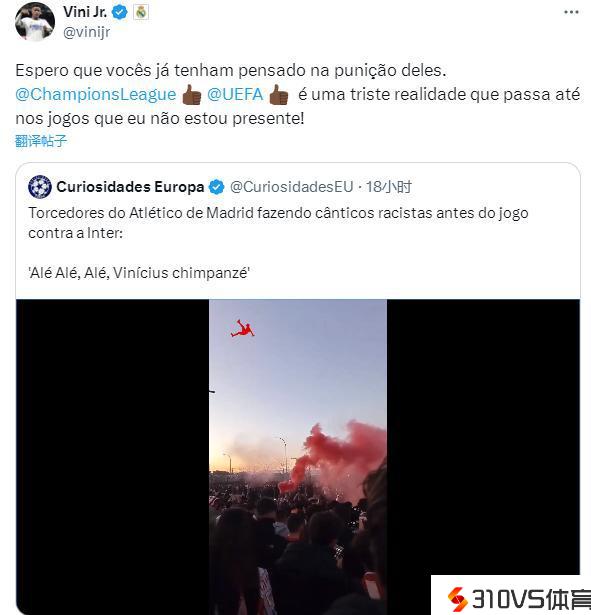 被马竞球迷欺侮!维尼修斯:希望欧足联处分理想令人忧伤