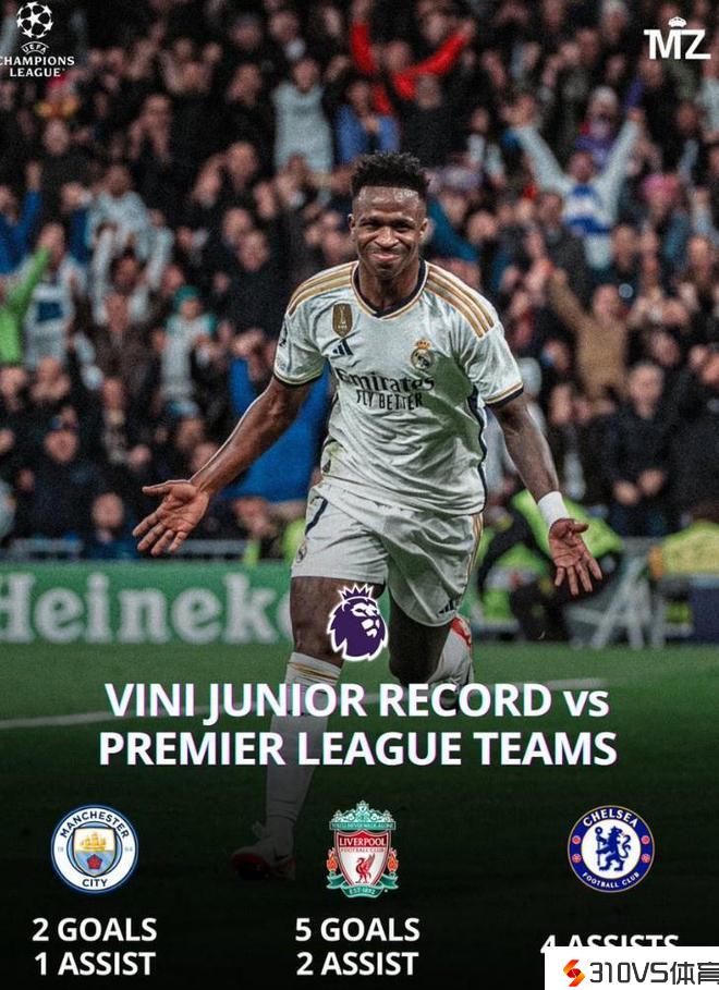 维尼修斯欧冠对英超球队数据:16场参与14球,对阵曼城2球1助攻