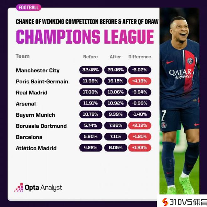 OPTA最新欧冠夺冠概率:曼城仍第一,巴黎反超皇马升至第二