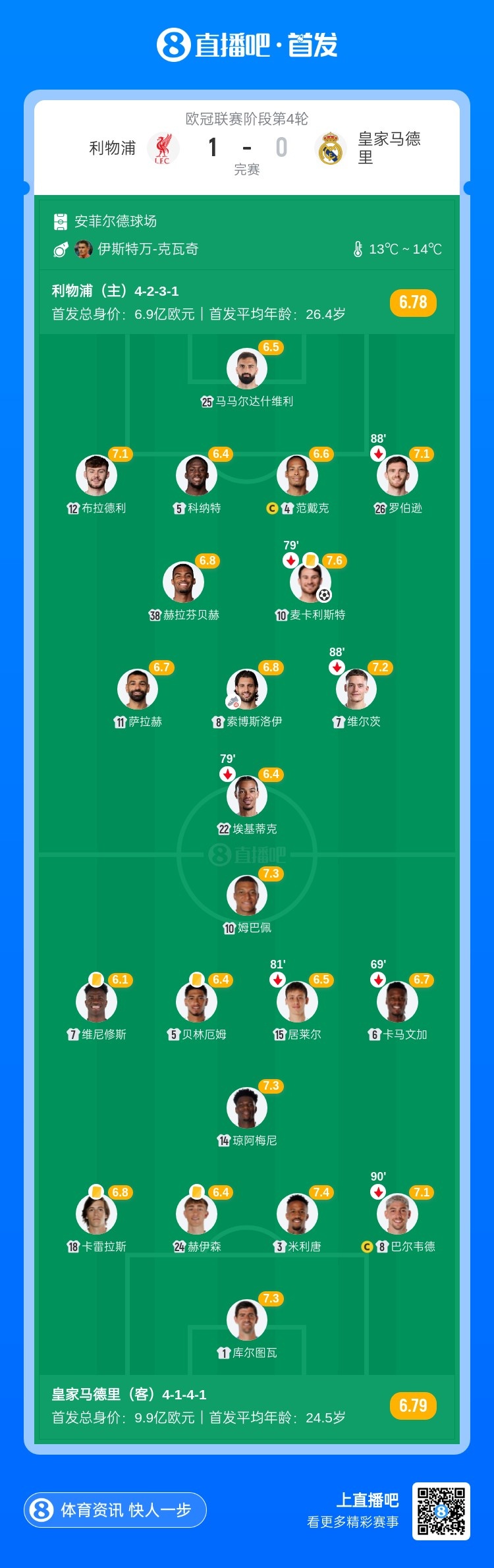 第61分钟,利物浦前场任意球机会,索博斯洛伊主罚送入禁区,麦卡利斯特头球攻门得手,VAR介入,最终进球有效,利物浦1-0皇马。↓