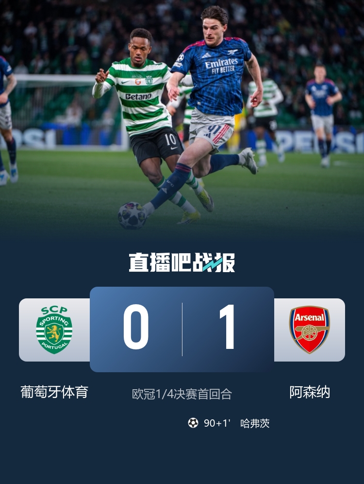 4月8日讯 北京时间4月8日凌晨4时,欧冠四分之一决赛首回合,阿森纳做客阿尔瓦拉德球场对阵葡萄牙体育。上半场双方均无建树,阿劳霍错失一次单刀良机,马杜埃凯开角球直接击中横梁弹出。阿森纳半场0-0战平葡萄牙体育。下半场,苏维门迪打进一球,但是队友越位在先,进球无效,替补登场的哈弗茨补时阶段完成绝杀。最终阿森纳1-0击败葡萄牙体育,两队次回合的比赛将于北京时间4月16日凌晨3时移师酋长球场进行。