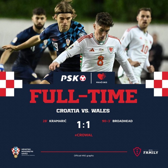 3月26日讯 欧洲杯预选赛D组,克罗地亚1-1战平威尔士,比赛第28分钟,克罗地亚反击机会,克拉马里奇禁区外接球转身过人破门,比赛补时阶段布劳德海德破门绝平。最终克罗地亚主场1-1战平威尔士。