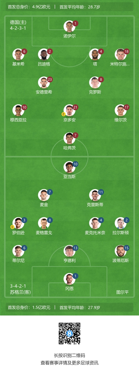 第68分钟,穆西亚拉斜塞禁区内,京多安没停好,但菲尔克鲁格得球,直接爆射右上死角破门!德国4-0苏格兰↓