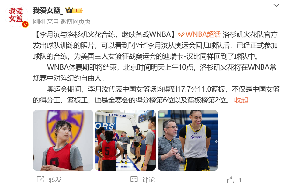 北京时间8月15日讯,根据媒体人@我爱女篮报道:李月汝与洛杉矶火花合练,继续备战WNBA。原文如下: