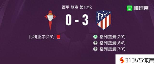 马德里竞技vs塞尔塔球员评分:格列兹曼9.3分,比利亚尔4.7分